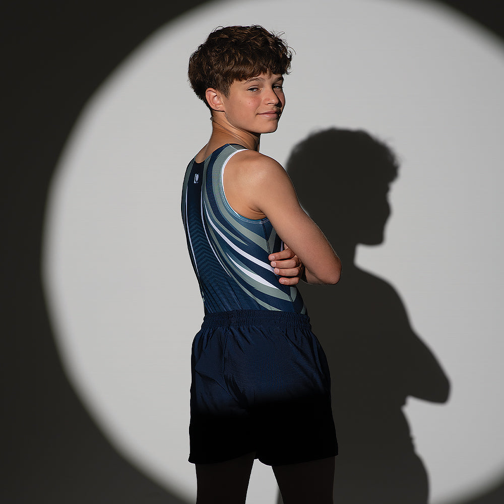 Renegade is all about keeping it sleek, simple, and sport-ready. Crafted from high-quality sublimated lycra, this men’s gymnastics leotard features a deep navy base accented with khaki and white curved lines that sweep down from the shoulders, creating a strong, dynamic silhouette. Its lightweight, stretch fabric allows full freedom of movement, making it ideal for training and competition alike. With a design that balances subtle style and high performance, Renegade is a go-to choice for athletes who want to look sharp without compromising on comfort. Engineered with Quatro's top-notch singlet pattern, this leotard offers a superior fit tailored for the male physique. Embrace comfort with the boxer cut leg design, eliminating any uncomfortable bunching. Complete the look with navy shorts.