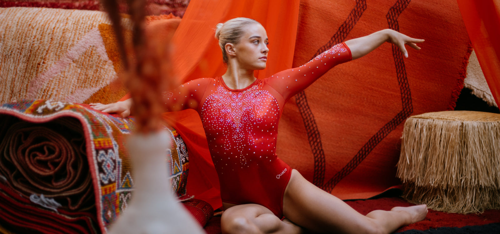The Saffron leotard, designed for the INSEP team to wear at the French National Championships has a sleek and sophisticated aesthetic. Featuring a black lycra body, and a high neck with black lycra binding and clasp closure, this design offers a structured look, while the circular cut-out gives the leotard a modern and fashionable edge. A black mesh panel at the waistline adorned with shimmering stones, creates a striking belt detail that adds a touch of refined sparkle. The stand out feature of this gymnastics leotard is the stunning explosion of flowers created by the arrangement of both standard and AB stones. These stones radiate out from the neckline and across the bodice, creating an intricate, floral pattern that sparkles from every angle, ensuring the gymnast catches every beam of light as they perform. With its super sparkly design, the Saffron leotard will shine brightly under the spotlight, making a bold statement on the competition floor.