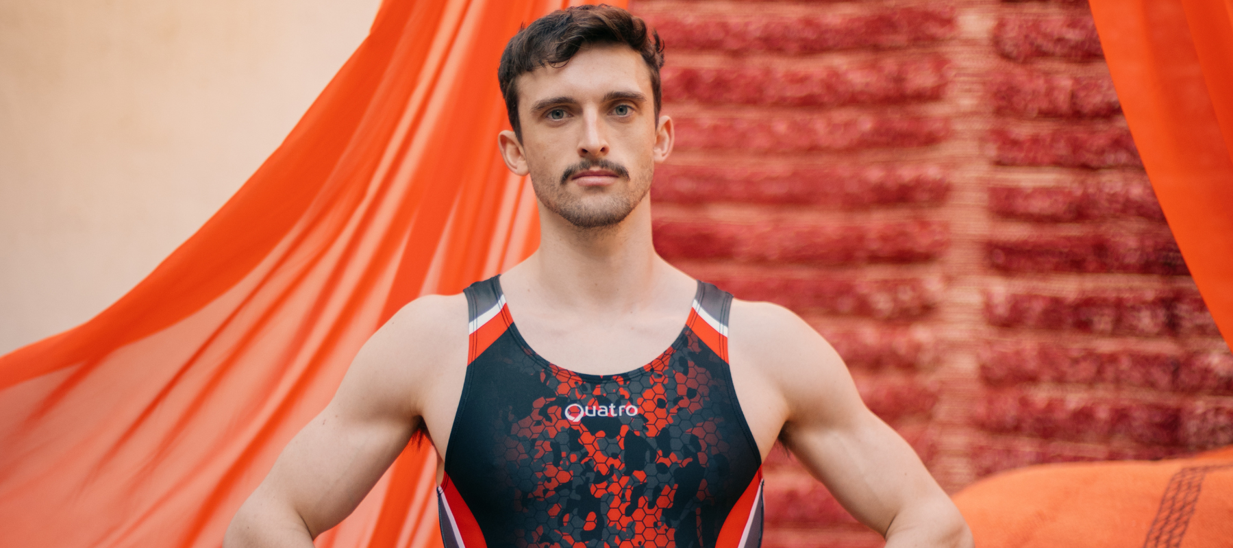 Designed by Olympic Gold Medalist Rhys McClenaghan, the Alpha leotard features a striking combination of red, black, and grey sublimated lycra. The design includes a honeycomb pattern overlaid with bold red and black accents, complemented by grey accents at the shoulders. This men’s gymnastics leotard merges dynamic style with high-performance functionality. Engineered with Quatro's top-notch singlet pattern, this leotard offers a superior fit tailored for the male physique. Embrace comfort with the boxer cut leg design, eliminating any uncomfortable bunching. Complete the look with the matching shorts.