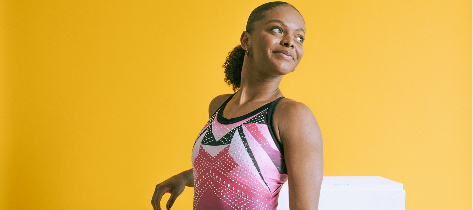 Artistry, designed by Trinity Thomas, celebrates bold design and striking detail, combining an array of vibrant colours with intricate embellishments. Featuring fully sublimated lycra in cherry, pink, rose gold, bubblegum, baby pink, and black, this leotard offers a captivating, multi-toned aesthetic. Black lycra binding provides a sleek, polished finish, while the race-style neckline and open back with a wide V shape add a modern and athletic edge. Cherry and black straps enhance the design, while AB, clear, and boat stones create a geometric pattern that beautifully highlights the sublimated lycra bodice. This leotard is the perfect choice for gymnasts who want to showcase their artistry and passion.