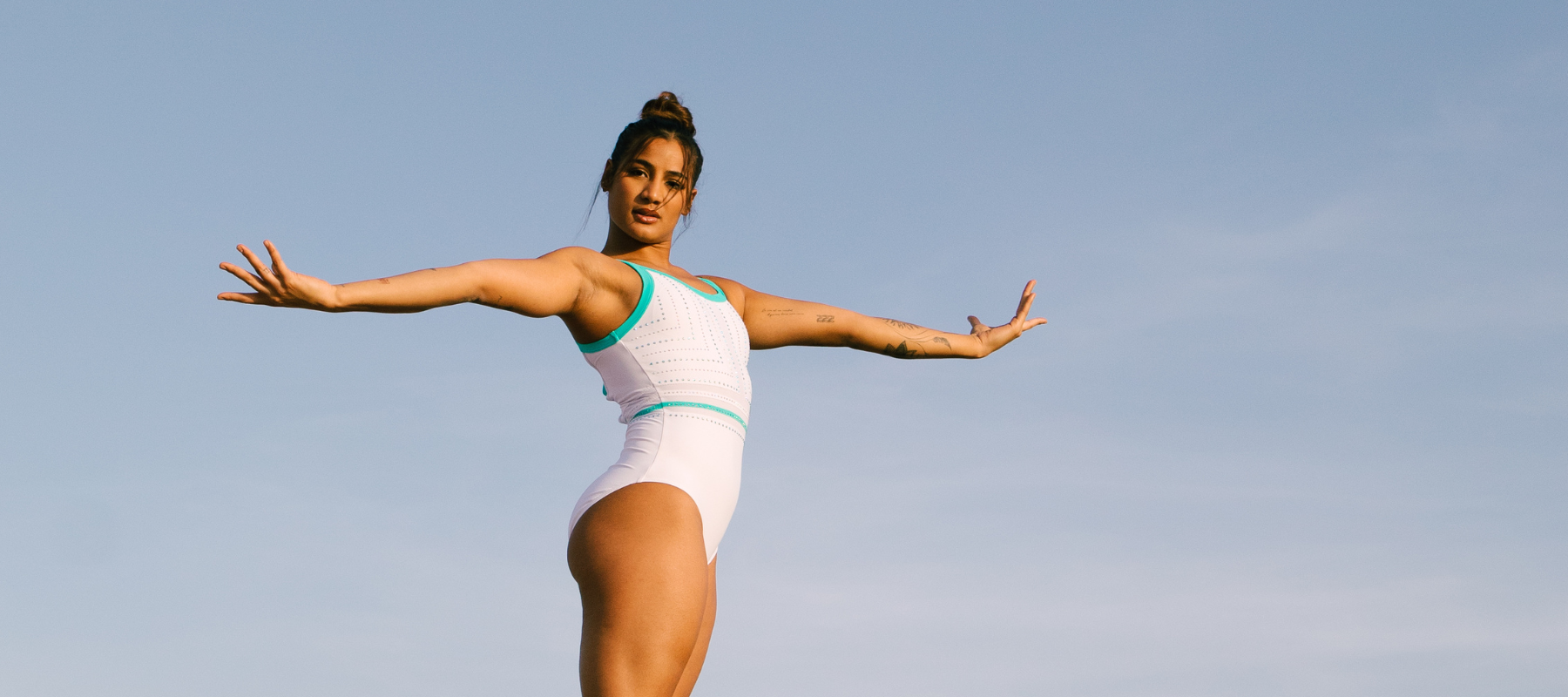 Infinite is a striking girls' gymnastics leotard designed for athletes who love clean lines and bold details. Made with a white lycra body and full white lining, it features a racer-style neckline framed in mint lycra binding. The standout open-back design includes crossover straps in mint and white lycra, creating a dynamic V shape at the back. A unique geometric stone pattern elevates the front, with alternating lines of Aquamarine and AB crystals flowing from the neckline and turning sharply toward the side seams at right angles. This structured sparkle brings both symmetry and shimmer to the look. At the waist, mint and white lycra appliqué with added stones creates a delicate belt effect for extra shape and style. Finished with a mint embroidered Quatro logo, Infinite is a fresh, modern leotard perfect for training or performance. It’s a must-have addition to any gymnast’s collection.