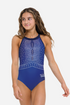 - Purple lycra body with purple and navy sublimated bodice in a fine grid pattern